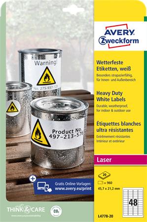 Etikett, 45,7x21,2 mm, poliészter, időjárásálló, AVERY ZWECKFORM, fehér, 960 etikett/csomag